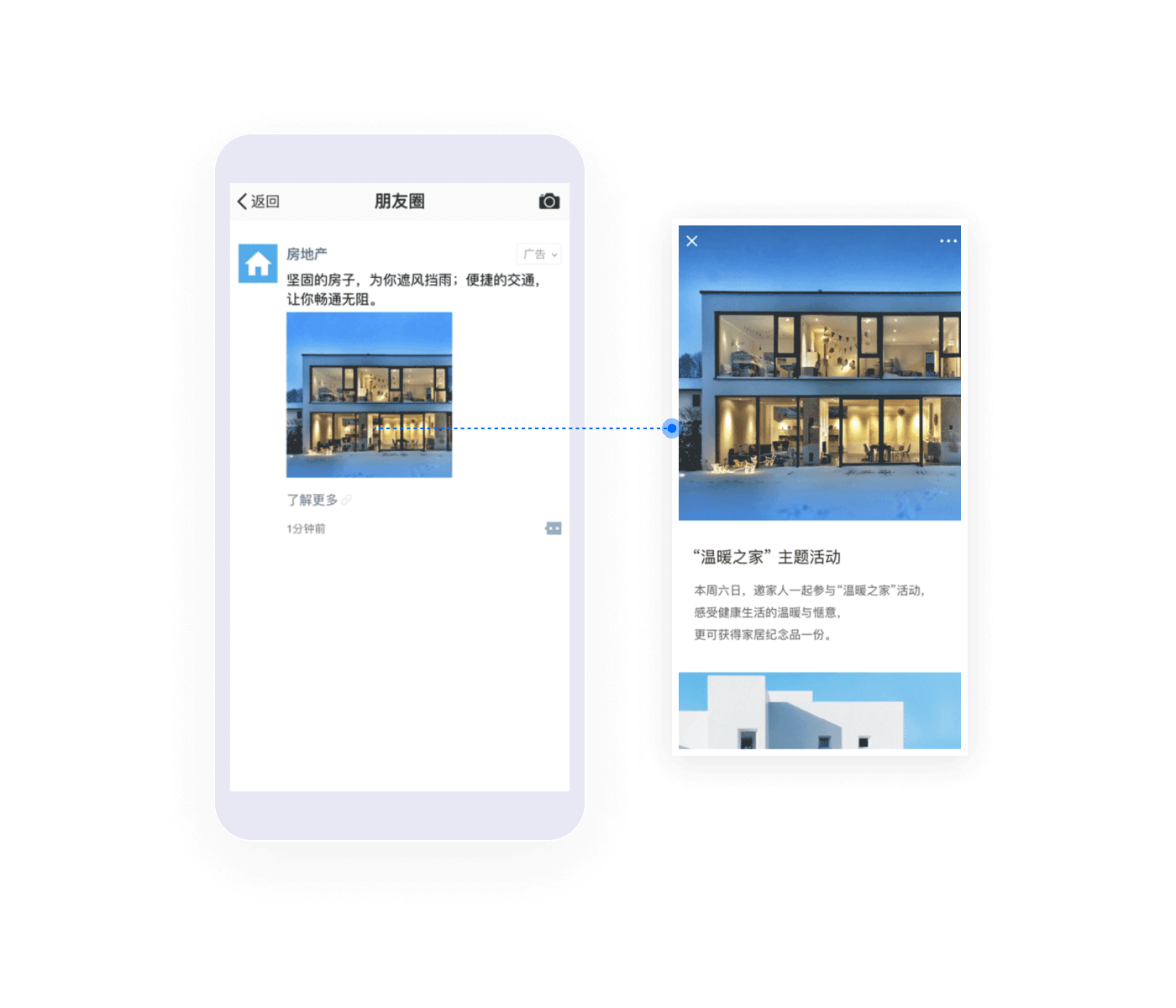 推廣視頻號動(dòng)態(tài)到微信廣告流量場(chǎng)景,在朋友圈以原生形式呈現,在公眾號小程序與場(chǎng)景相結合,可上滑展示廣告主更多視頻
